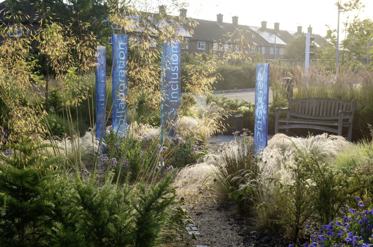 Created in memory of Martin Beard — a beloved community leader and head of Merstham Park School — this garden offers a quiet space for reflection and remembrance. Coloured etched glass reflects light within the landscape, displaying the values Martin inspired.