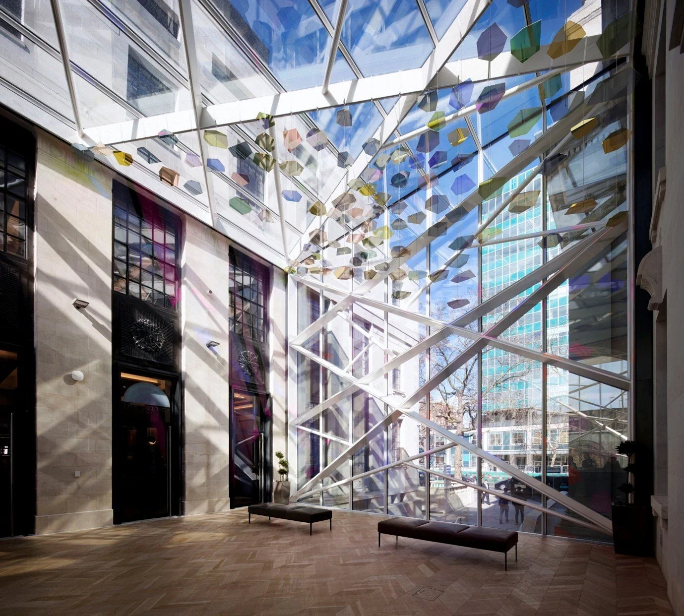 We produced and installed the 100 geometric shards that made up Fenella Osborne’s stunning dichroic glass sculpture that graces the link bridge building of the Sammy Ofer Centre at the London Business School.With its dynamic play of light and colour, this piece captures movement, energy, and creativity—reflecting the spirit of innovation at LBS.
