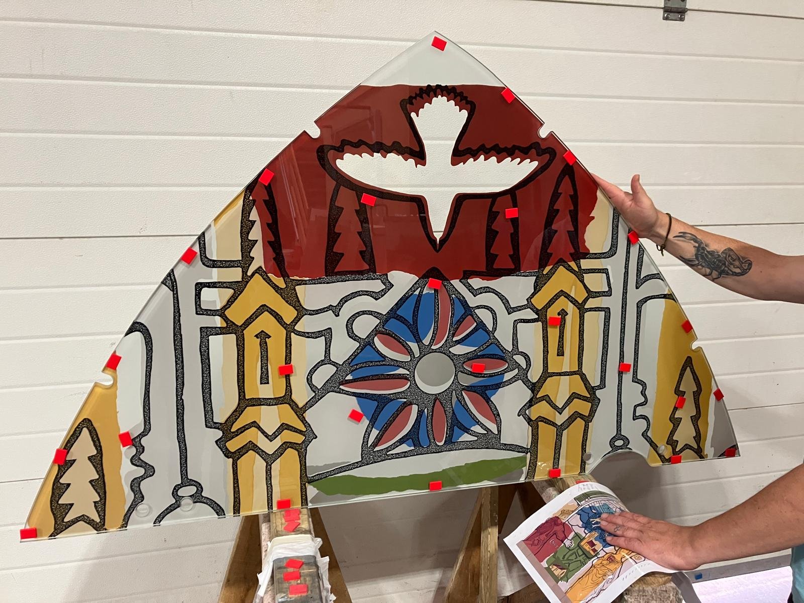 Created using sandblasting and transparent enamels, the glass captures scenes and symbols drawn from the village’s history, weaving together stories of place and people through light and texture. The result is a modern intervention that respects the church’s ancient fabric, offering accessibility while reflecting the enduring spirit of the village.