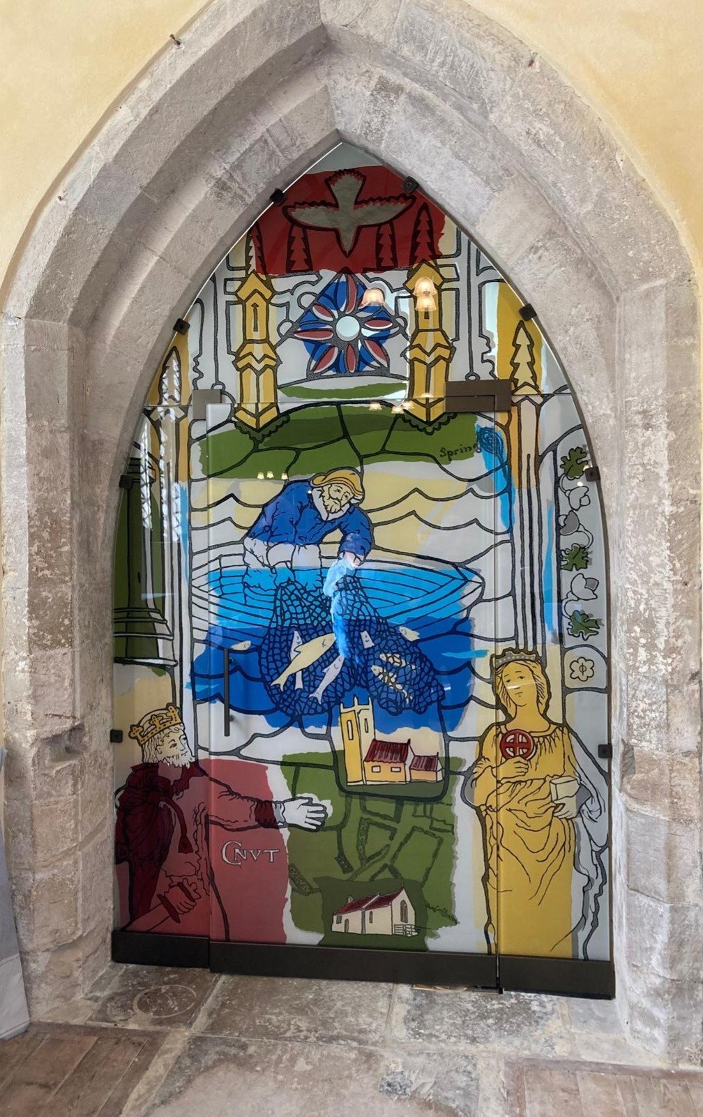 Set within the beautiful 14th-century St Peter’s church in Dorset, this toughened glass screen and disabled-access door serves as both a practical enhancement and a work of art. Designed to celebrate the village’s rich heritage—granted its charter by King Cnut a thousand years ago—the screen is etched and illuminated with imagery inspired by the local landscape, community, and centuries of faith.