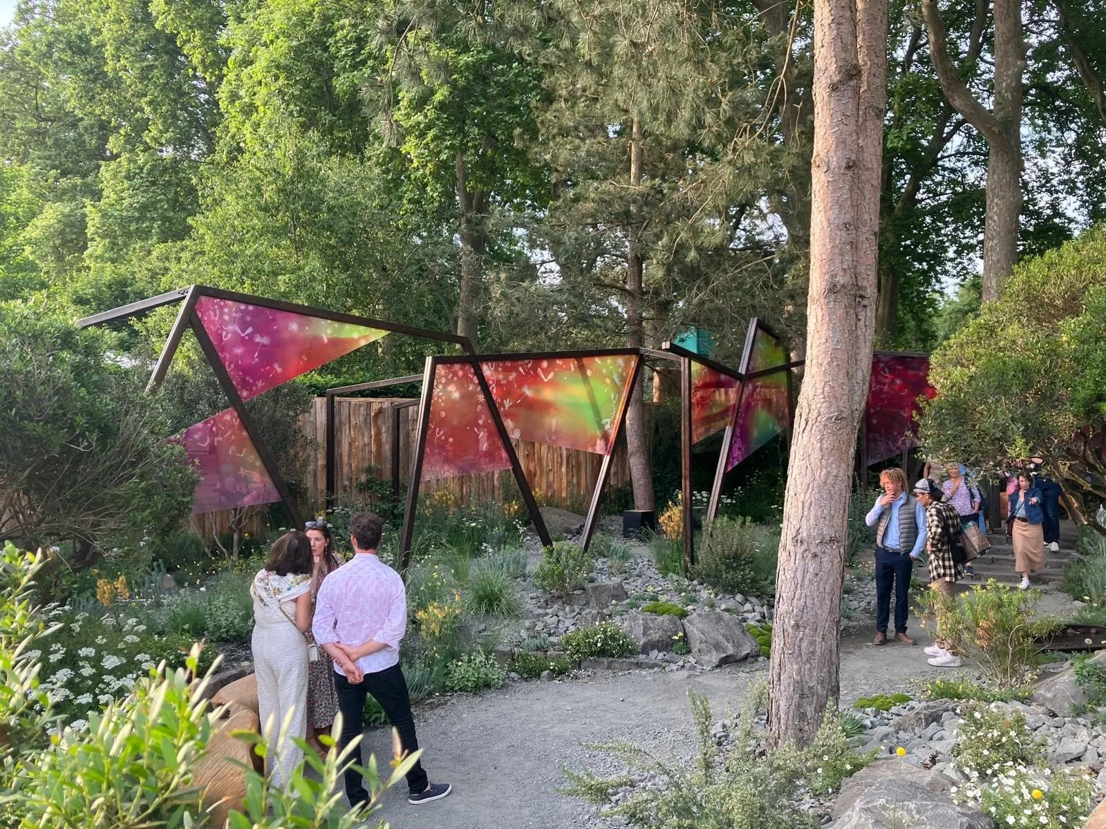 The gold medal winning garden was designed by Joe Perkins and inspired by nature’s ability to thrive in hostile environments. The glass panels were designed by James Cockerill of HALTglass to portray an artistic representation of seed dispersal.