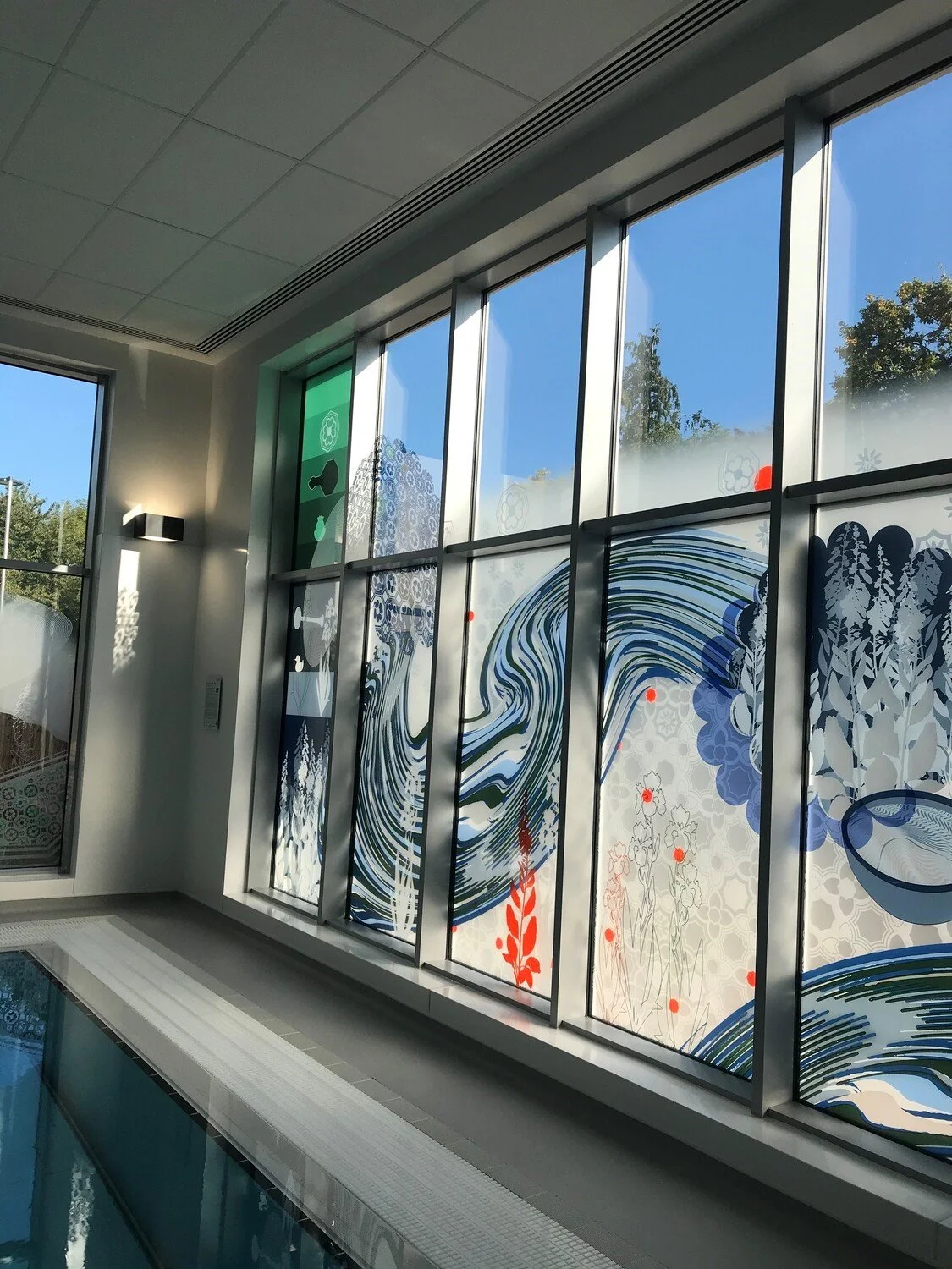 The glass screens for the Hydrotherapy Pool were commissioned by Hetty Dupays, Art & Design Manager for Art at the Heart of the RUH. Christopher also worked closely with Gina Sargeant, Head of Therapies, who emphasised the importance of the patient experience during therapies.